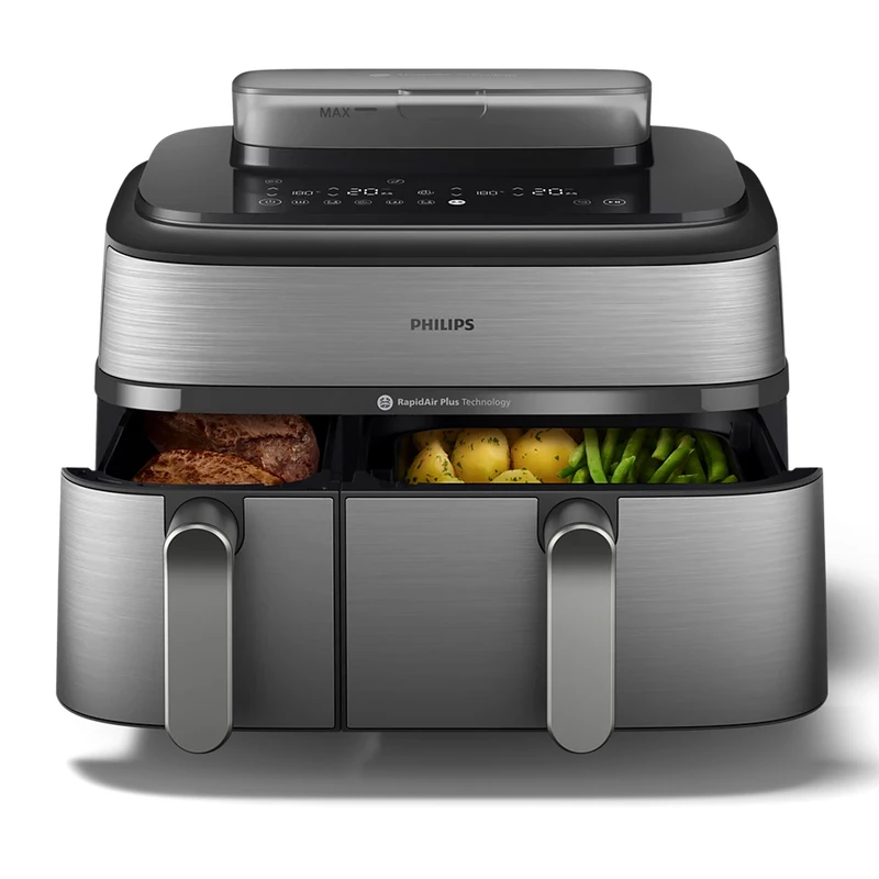 فناوری RapidAir Plus و Air Steam برای پخت بهتر / قابلیت پخت دوکاره: بخارپز و سرخکن / قابلیت تنظیک تایمر تا ۶۰ دقیقه / ۱۲ برنامه پیشفرض برای پخت متنوع / دارای دو سبد جداگانه برای پخت غذاهای مختلف / یکی از سبدها مجهز به قابلیت بخارپز